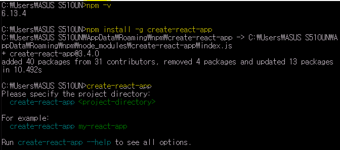 4) 다음 명령어를 통해 create-react-app이 잘 설치되었는지 확인한다.