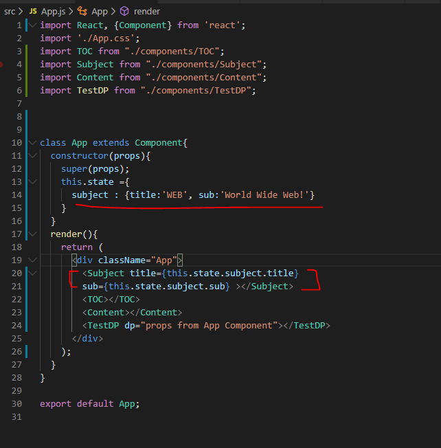 다음으로 Subject컴포넌트에서 title과 sub인 props값들을 this.state.subject.title과 this.state.subject.sub로 전달해준다.