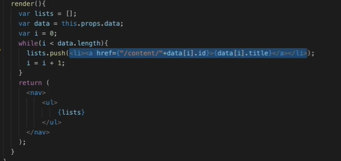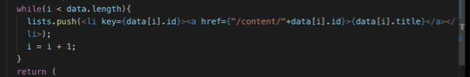 while을 통해 lists라는 배열에 <li>를 추가하고, 이를 나중에 ul태그의 하위 태그로 넣어준다.