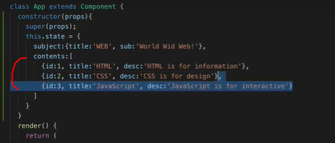 왼쪽 사진은 App컴포넌트의 state로 contents라는 객체 배열을 넣어준 것이고,