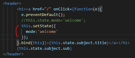 그럼 그냥 onclick안에 this.state.mode = 'welcome'이라고 쓰면 될까? 그렇지 않다.