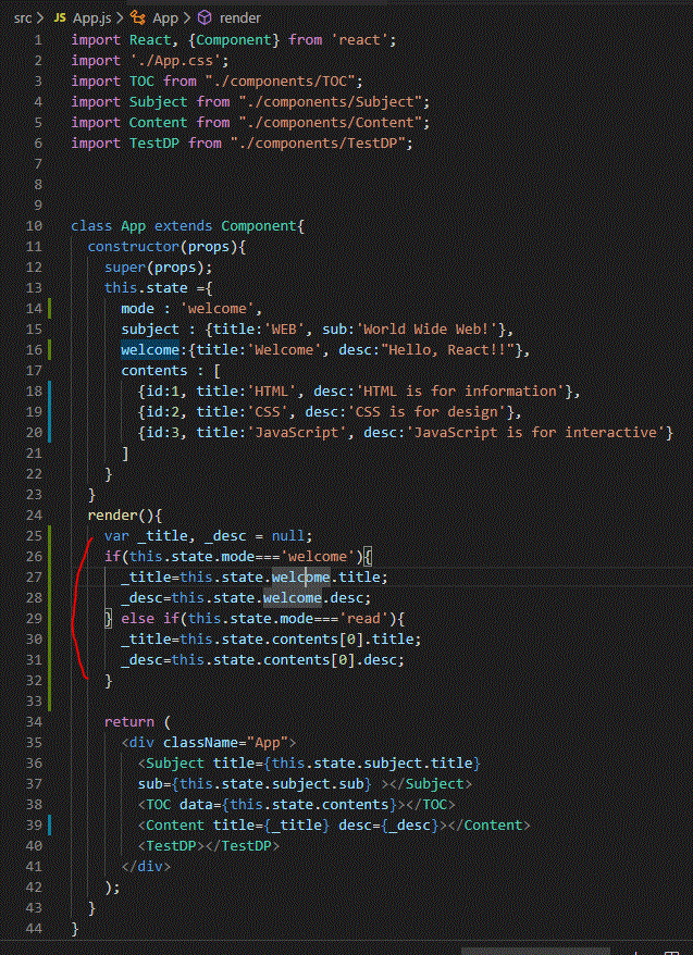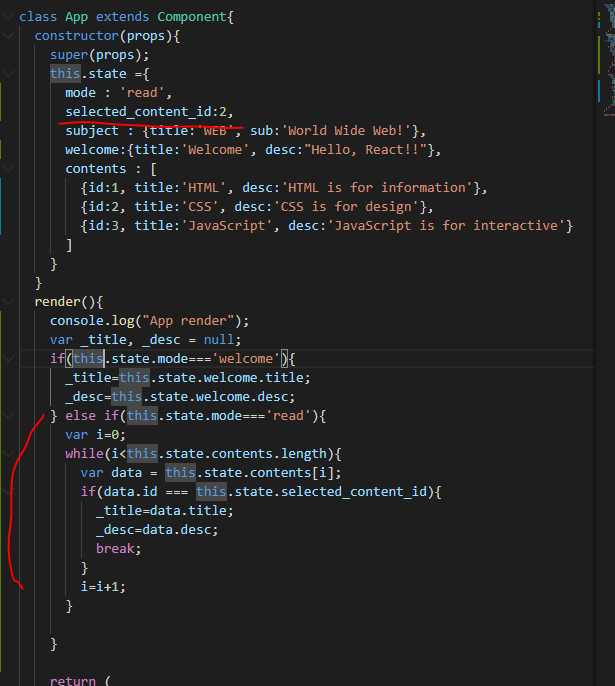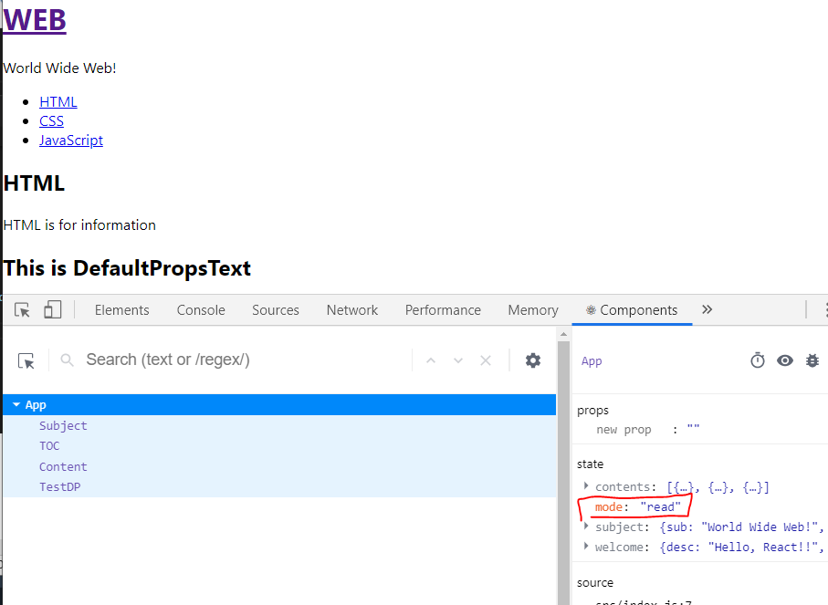 현재 페이지가 welcome페이지인지 read페이지인지 구분하기 위해서 state에 mode라는 값을 둘 것이다.
