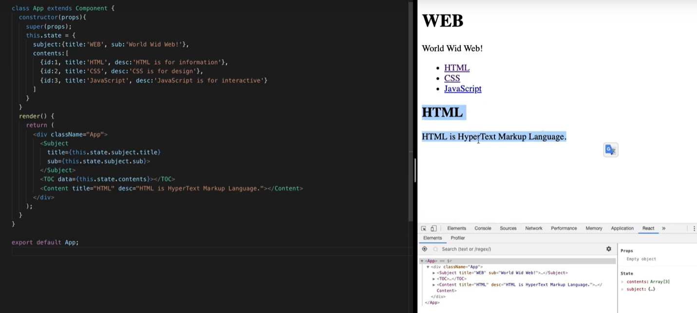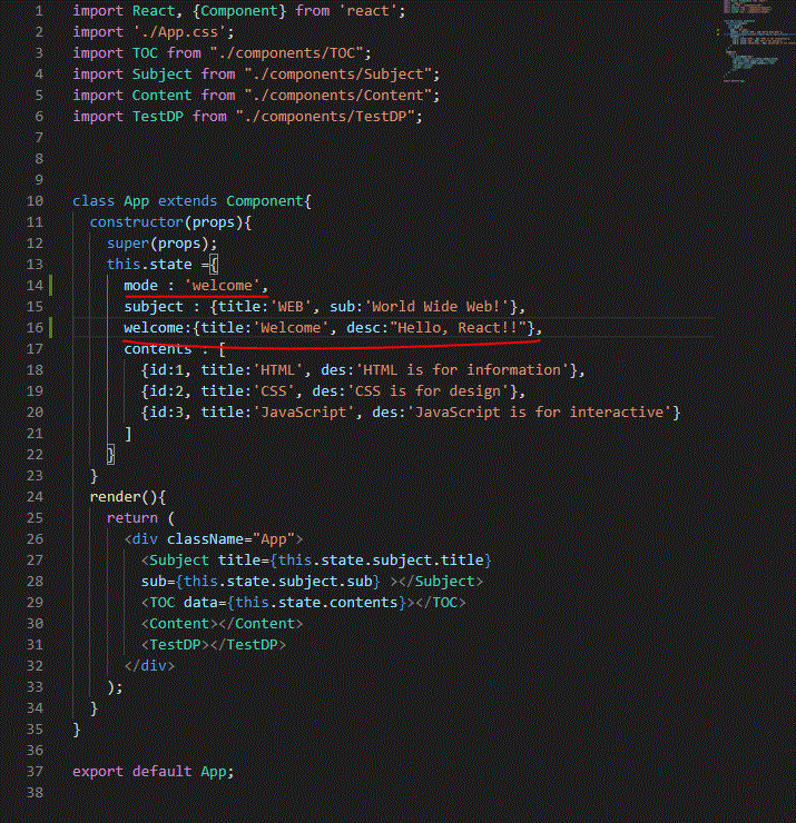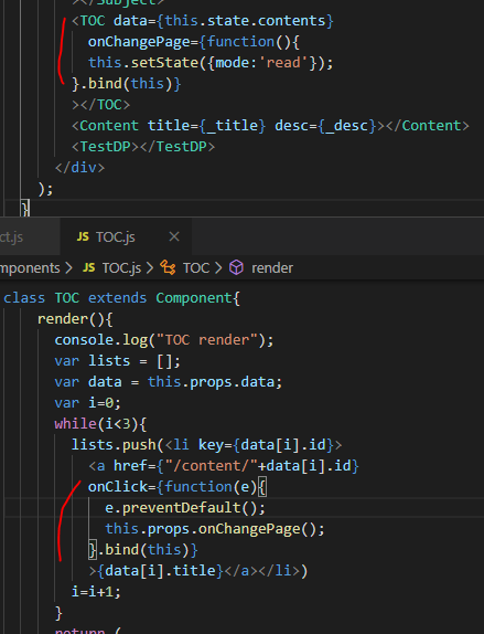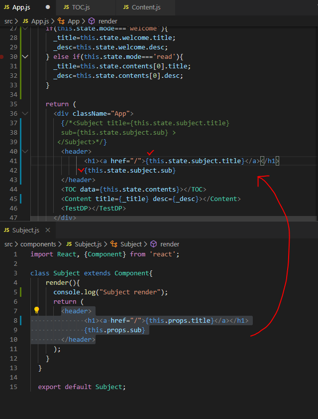 저번에 props를 전달할 때 <Subject title={this.state.title}></Subject>라는 식의 전달 방식을 사용하였다.