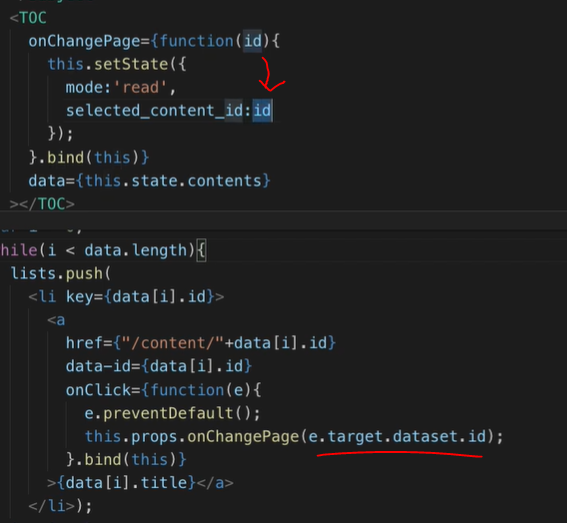 TOC.js파일 안의 <a>에서 onClick함수에서 onChangePage함수를 호출하면서 e.target.dataset.id를 전달한다.
