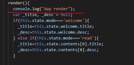 state값이 바뀌면 render가 호출된다고 말하였는데, 그것을 확인하기 위해 render함수 다음에 console.log를 찍어보았다.