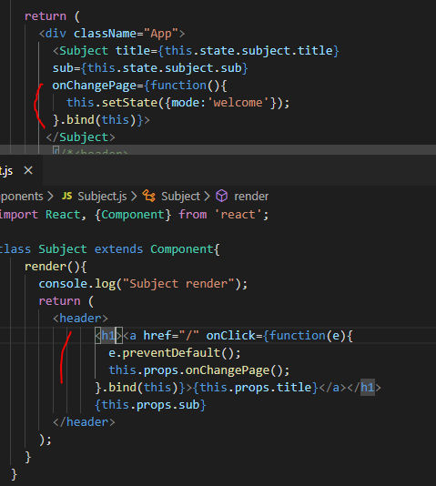 왼쪽의 코드처럼 App.js에서 Subject의 props로 onChange함수를 전달해준다.
