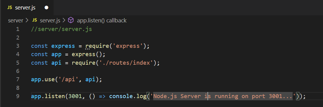 포트번호는 3001번으로 할당하였고, '/api'의 경로 요청을 라우팅해주었다.